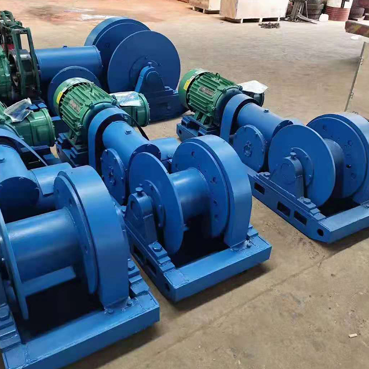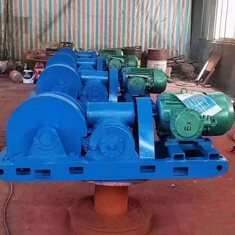 絞車主要由防爆電動機(jī)、一組斜齒輪、蝸輪減速器、過橋齒輪、傳動齒輪,卷筒及底座等主要部分組成
