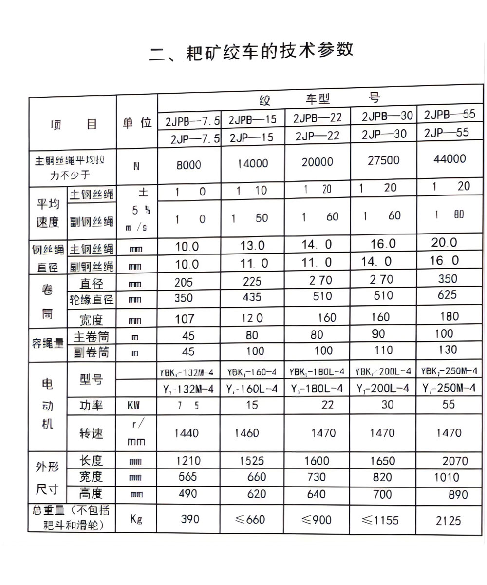 三、2JPB系列耙礦絞車的技術(shù)參數(shù)