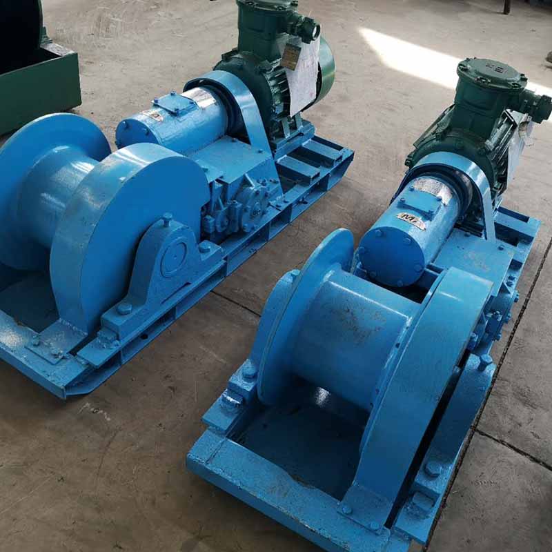 絞車主要由防爆電動機、一組斜齒輪、蝸輪減速器、過橋齒輪、傳動齒輪,卷筒及底座等主要部分組成